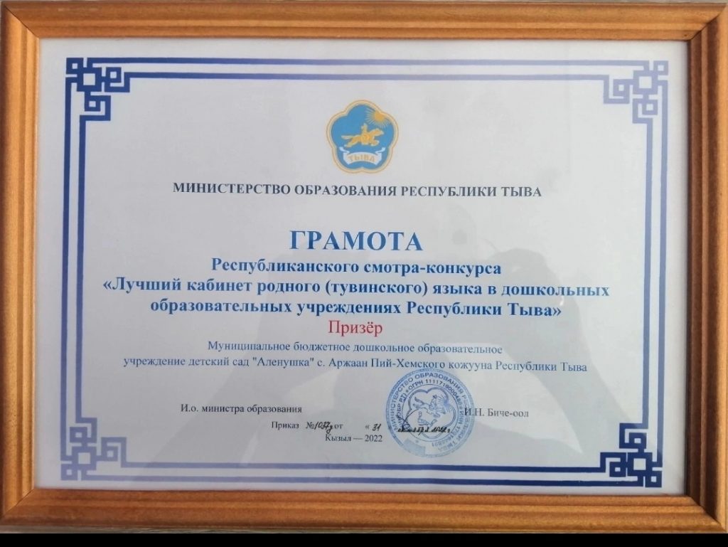 В рамках исполнения мероприятий государственной программы Республики Тыва «Развитие государственных языков Республики Тыва на 2021 — 2024 годы и регионального проекта» Тувинский язык — детям Тыва дыл — бичии чаштарга» Министерства образования РТ объявило конкурс-смотр» Лучший кабинет тувинского языка в дошкольных учреждениях Республики Тыва» по результатам которого, МБДОУ детский сад «Аленушка» с.Аржаан Пий-Хемского кожууна занял второе место и получил сертификат на приобретение цветного принтера. Это уже второе участие в данном конкурсе, наш сад дважды стал призёром и удостоен второго места.