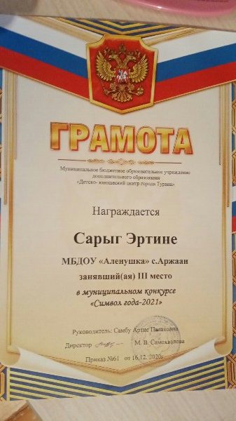Воспитанник подготовительной к школе группы Сарыг Эртине занял 3 место в кожуунном конкурсе поделок «Символ года -2021»
