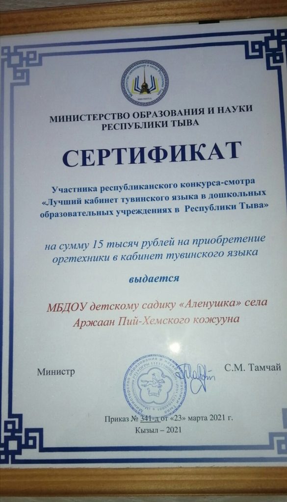 Без рубрики Поздравляем нашу воспитательницу МБДОУ детский сад «Алёнушка » с. Аржаан. Оюн Эллу Федоровну за успешное выступление в региональном смотре-конкурсе «Лучший кабинет тувинского языка в дошкольных образовательных учреждениях». 13.05.2021 /