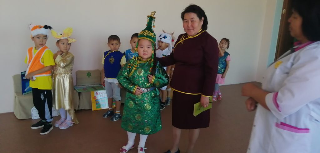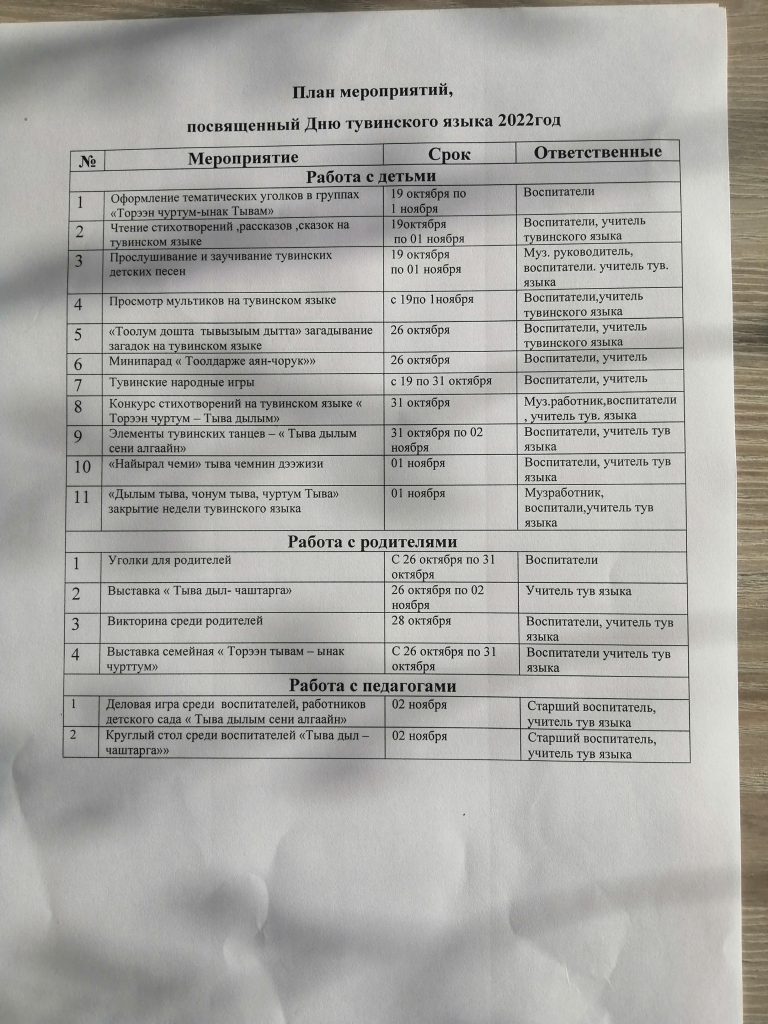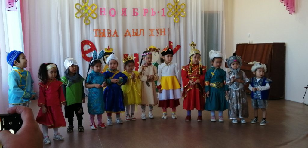В нашем детском саду с 26 октября по 1 ноября прошла тематическая неделя, посвященная дню Тувинского языка. Дети слушали и инсценировали тувинские народные сказки, сочиняли и отгадывали загадки, заучивали потешки, читали стихи тувинских поэтов, играли в тувинские народные игры, водили хороводы, пели песни, приняли участие в выставке рисунков. Детям накрыли стол из национальных блюд.