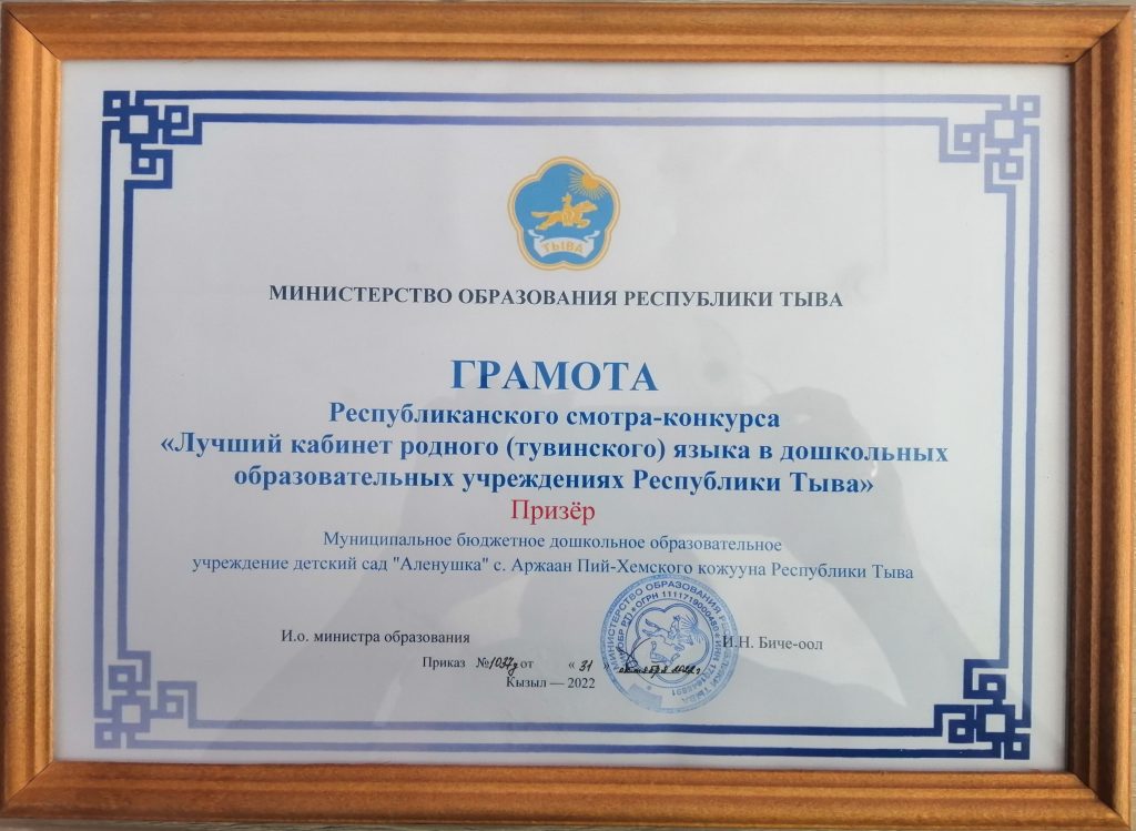 Институтут развития национальной школы и министерство образования РТ объявило конкурс-смотр «Лучший кабинет тувинского языка в дошкольных учреждениях Республики Тыва» по результатам которого,МБДОУ детский сад «Алёнушка с.Аржаан Пий-Хемского кожууна стал призёром конкурса заняли 2 место и получили цветной принтер. Выражаем благодарность Министерству образования Республики Тыва,Институту развития национальной школы.